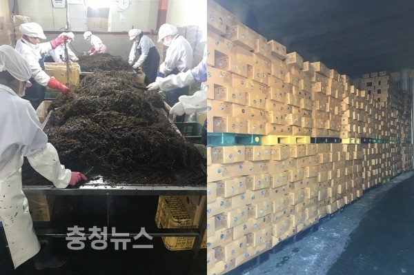 (왼쪽) 완도 작업장에서 선별 중인 모자반,(오른쪽) 저장고에서 출하 대기 중인 모자반