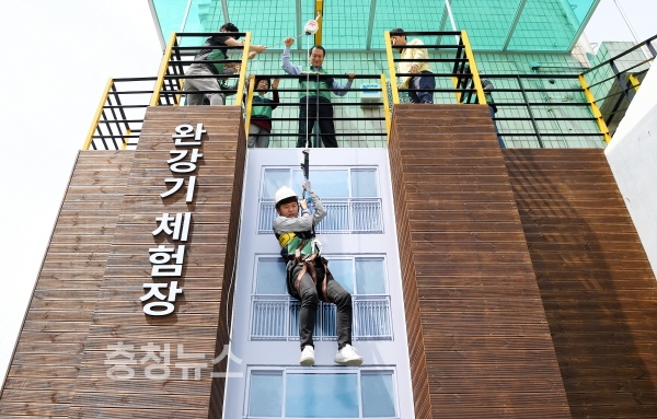 대전 중구(구청장 박용갑)가 완강기 체험장 설치를 완료하고 26일 첫 체험교육을 실시했다.