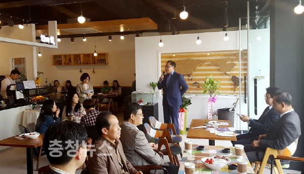 26일 원신흥동에 개소한 자활3호기업 ‘더 쉼’ 카페 개소식에서 김일기 유성구 사회복지국장이 인사말을 하고 있다