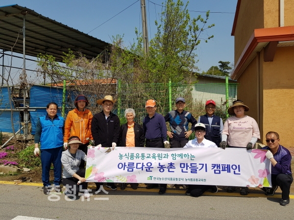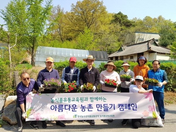 aT 농식품유통교육원은 지난 25일 경기도 화성시 매송면 천천리 일대를 찾아 마을 공터 및 마을회관주변에 베고니아, 메리골드, 봉선화 등 초화류를 400여주를 식재하고 영농 폐비닐 수거, 마을청소 등 아름다운 농촌 만들기 캠페인(舊CAC, Clean Agriculture Campaign)을 전개했다.