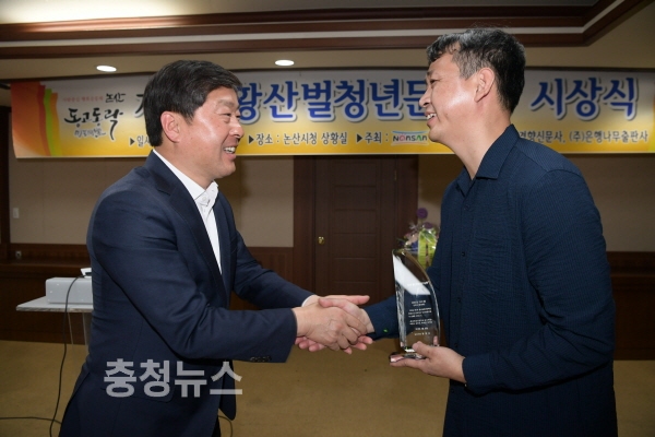 제4회 황산벌청년문학상 시상식장면) - (왼) 황명선논산시장 (오) 수상자 강태식씨