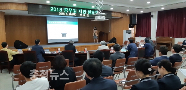 충남 부여군은 지난 25일 여성문화회관 대강당에서 2018 공무원 창의제안 발표대회를 개최했다.