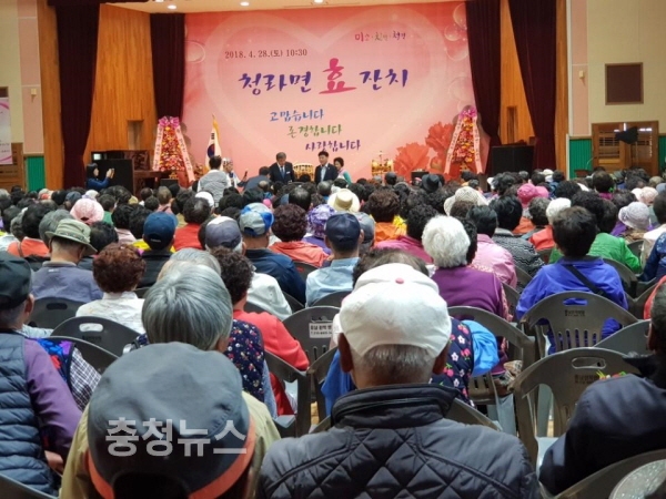 충남 보령시 청라면은 28일 오전 청라중학교에서 어르신과 주민 등 1000여 명이 참석한 가운데 청라면체육회와 새마을지도자협의회 공동 주관으로 어르신 효잔치를 개최했다고 밝혔다.