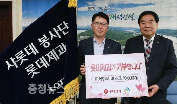 롯데제과(주)대전공장(공장장 양갑석)이 30일 구민의 사랑방에서 미세먼지 방지용 마스크 10000개를 대덕구(구청장 박수범)에 기탁했다.