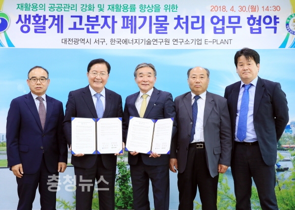 대전 서구는 30일 구청 다목적실에서 한국에너지기술연구원 연구소기업 E-PLANT(대표 박천상)와 지역 협력형 자원순환체계를 구축하기 위해 ‘생활계 고분자 폐기물 처리방안’에 대한 업무 협약을 체결했다고 밝혔다.