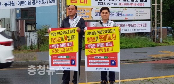 대전 대덕구단체장협의회(회장 오연진)가 2일 아침 농수산 오거리에서 유료도로 기능을 상실한 천변고속화도로 통행료 폐지를 촉구하는 피켓시위를 벌였다.