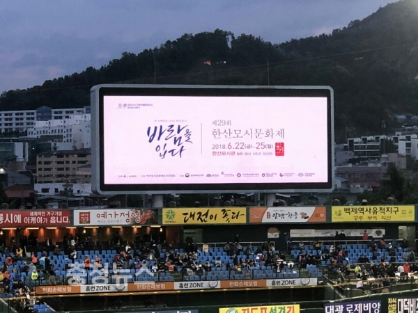 경기장 내 스크린에 서천군 홍보영상을 비롯한 소곡주 제작과 한산모시문화제 영상 재생은 물론 서천군 특산품 홍보관을 따로 마련해 한산모시, 소곡주, 모시떡, 모시젓갈 등 서천 지역특산품 홍보 및 판매하며 이날 야구장을‘서천’ 홍보로 가득 채웠다.