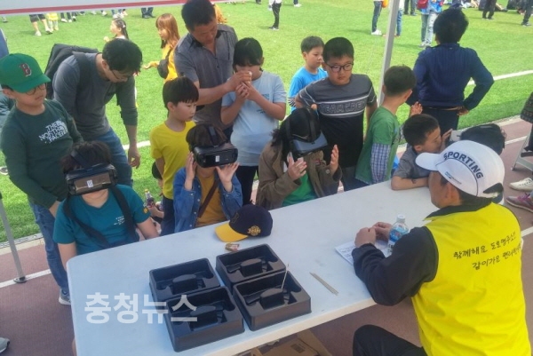 충남 예산군이 지난 5일 예산종합운동장에서 미래세대 도로명주소 사용자인 어린이를 대상으로 도로명주소를 홍보하기 위해 ‘VR(가상현실)체험’ 행사를 열어 눈길을 끈다.