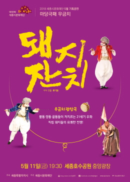 세종시문화재단(대표이사 인병택)은 5월 가족의 달을 맞아 온 가족이 즐길 수 있는 공연 ‘마당극 돼지잔치’를 오는 11일 저녁 7시 30분부터 세종호수공원 중앙광장에서 진행한다.