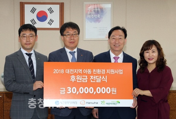 대전교육청은 9일 청사 내 접견실에서 한화대전사업장, 한화종합연구소, 초록우산어린이재단 대전지역본부와 지역 아동 친환경 지원사업 후원금 전달식을 열었다.