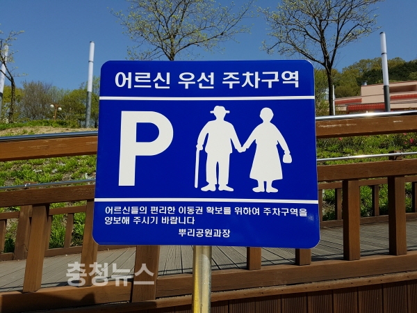 효 테마공원인 뿌리공원을 찾은 노령의 운전자를 배려해 공원 입구 길목에서 가장 가까운 곳에 눈에 잘 띄는 노란색으로 12개의 주차면을 만들고‘어르신 우선 주차구역’표지판 2개를 설치했다.