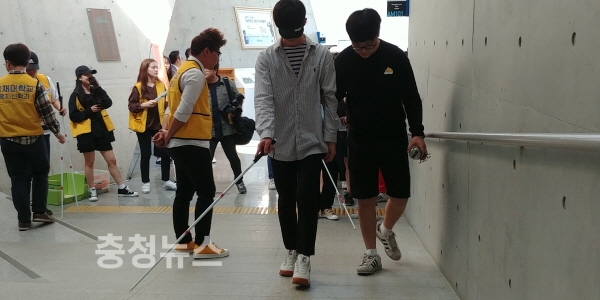 휠체어에 몸을 의지한 학생들은 낮은 경사로도 혼자 오르기 벅찼다. 빗물이 요기 나게 빠지도록 만든 스틸 그레이팅엔 휠체어 앞바퀴가 빠져 고전을 면치 못하기도 했다. 안대로 눈을 가리고 흰자팡이로 바닥을 짚어가던 학생들은 불안감을 온몸으로 표출했다.