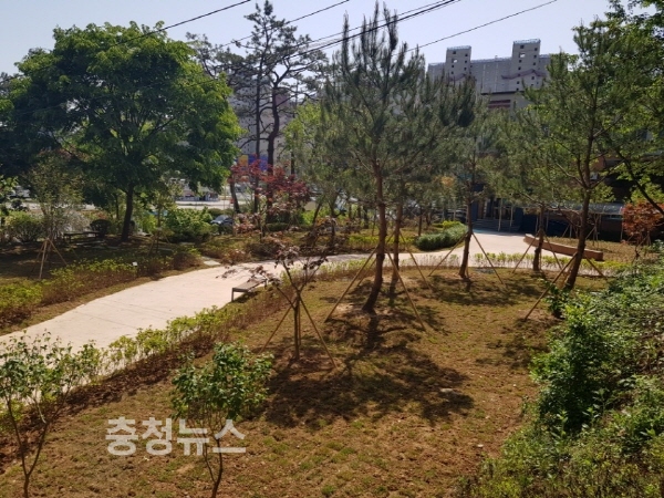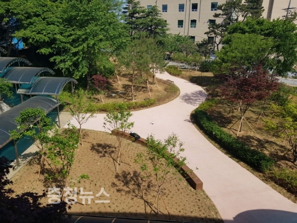 지난 2월 학교 정문 옆 나대지에 꽃과 나무가 어우러지는 숲 조성을 목표로 소나무 등 16종 3417주의 나무와 초화를 식재해 녹색 숲과 쉼터로 탈바꿈 시켰으며, 휴식과 산책을 위한 편익시설 등을 시공해 학생은 물론 인근 주민들에게 숲체험과 소통공간으로 활용할 수 있게 했다.