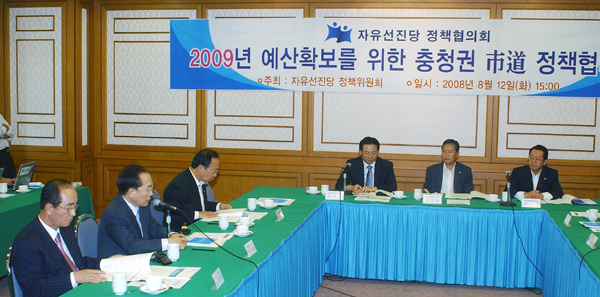 정책협의에는 대전 박찬우 행정부시장,충남 김동환부지사. 충북 이종배 부지사가 참석한 가운데 광역단체 예산확에 선진당 국회의원들의 적극적인 관심과 협력을 당부했다.