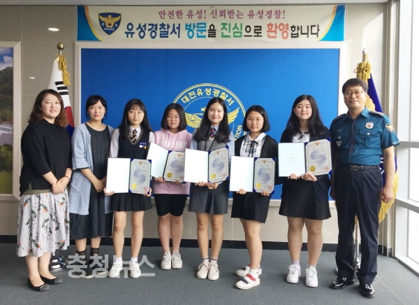 대전 유성구는 17일 유성경찰서 중회의실에서 유성구청소년상담복지센터(센터장 서선미) 1388또래지원단 김현지 등 6명이 유성경찰서(서장 이동기)로부터 청소년 유공 표창을 받았다고 밝혔다.