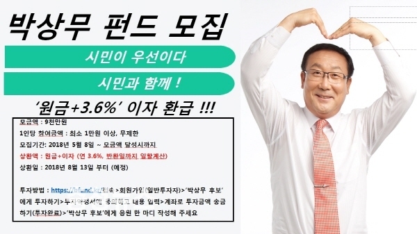 박상무 서산시장 후보 선거캠프에서는 17일 시민의 자발적인 선거참여와 깨끗하고 새로운 선거문화를 정착시키기 위한 방법의 일환으로, '박상무 선거펀드 2차모집'을 오는 "21일 오전 9시부터 재개한다"고 밝혔다.