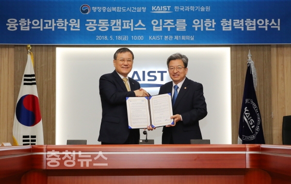행정중심복합도시건설청(청장 이원재, 이하 행복청)과 KAIST(총장 신성철)는 18일 KAIST 본관 회의실에서 ‘융합의과학원’의 행복도시 공동캠퍼스 입주를 위한 합의각서를 체결했다고 밝혔다.