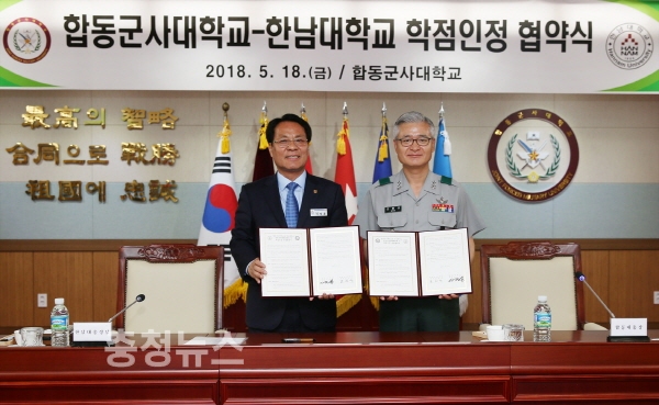 한남대 이덕훈 총장(왼쪽)과 합동군사대학교 조한규 총장(오른쪽)이 18일 학점인정 협약을 체결하고 있다.