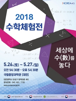 국립중앙과학관(관장 배태민)은 국가수리과학연구소와 공동주관으로 5월 가정의 달을 맞이해 온 가족이 함께 즐길 수 있는 체험형 수학축제“2018 수학체험전”을 이달 26일부터 27일까지 2일간 국립중앙과학관에서 개최한다고 23일 밝혔다.