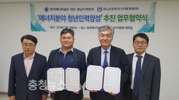 한국에너지공단 대전충남지역본부(본부장 김주완)는 23일 충남대학교 인재개발원(원장 민윤기)과 ‘에너지 분야 청년인력양성’ 추진을 위한 업무협약을 체결했다.