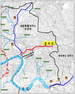 올해부터 2021년까지 사업비 66억 원을 들여 부강면약수터~백천합류지점 1.62km구간에 생태유량확보 관로 설치, 생태호안 정비, 생태탐방로 조성 등 복원사업을 추진한다.