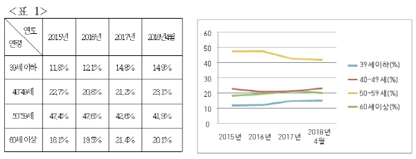 이 분석 자료에 의하면 2014년까지는 39세 이하의 청년층이 10%에 못 미치는 비율이었지만 ▲2015년 11.8% ▲2016년 12.1% ▲2017년 14.8% ▲2018년 4월 14.9%를 기록, 지속적으로 증가하는 양상을 띠었다.