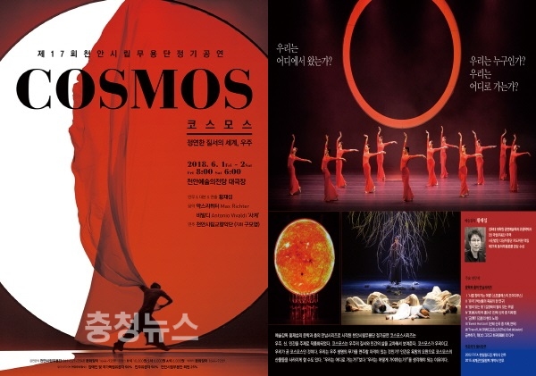 천안시립무용단의 제17회 정기공연 무용극 ‘코스모스’는 천안시립무용단 황재섭 예술감독의 문학과 춤 시리즈 최종 완성작으로 인간과 신이라는 주제를 우주적 관점에서 접근한 작품이다.