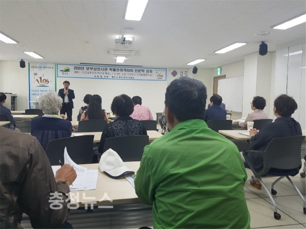 충남 예산군 지명 탄생 1100주년을 기념하고 내포보부상촌 홍보를 위해 준비한 ‘보부상전시관 박물관아카데미’ 인문학 강좌 수업이 주민들의 뜨거운 관심을 속에 지난 24일 예산군내포문화사업소 2층 회의실에서 개강했다.