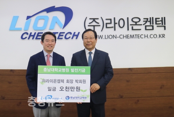 충남대학교병원 송민호 원장은 ㈜라이온켐텍 박희원 회장으로부터 30일 충남대학교병원 발전기금으로 5천만원을 기부받았다.