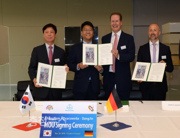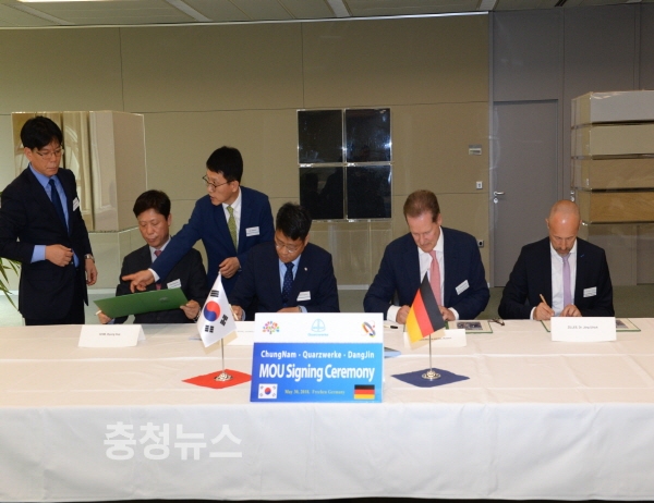 충남 당진시는 지난 30일 오전 11시(현지시간) 시와 충남도가 독일 프레첸에 위치한 쿼츠베르크(Quarzwerke) 본사에서 16백만 불(13백만 유로) 규모의 투자협약을 체결했다.