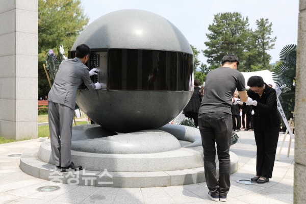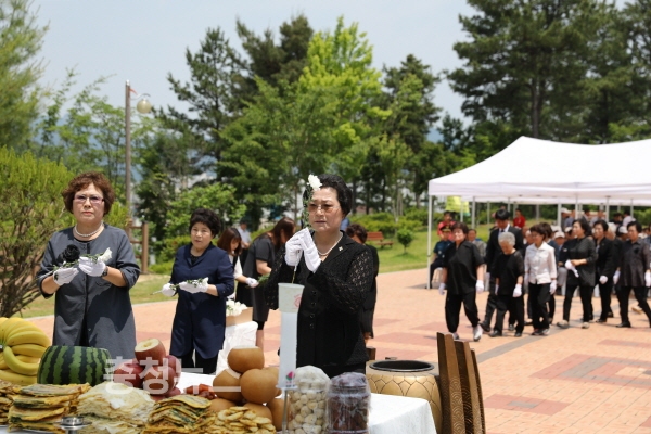 이어 충령탑 봉안식에는 국민의례, 참가자일동 제배, 유족, 미망인지회장의 헌화 및 분향 순으로 엄숙히 거행됐다.