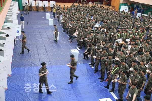 6월 13일 실시되는 제7회 전국동시지방선거 사전투표 첫날인 8일 오전 연무문화체육센터에 마련된 사전투표소에서 논산 육군훈련소 훈련병과 기간병 장교들이 투표를 하고 있다.