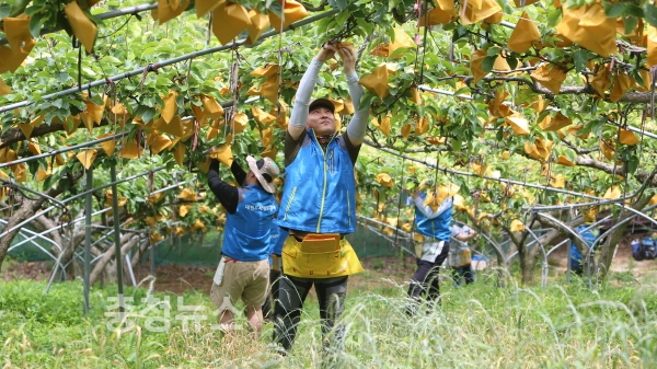 대전 서구 산직동에 있는 배 농장에서 구슬땀