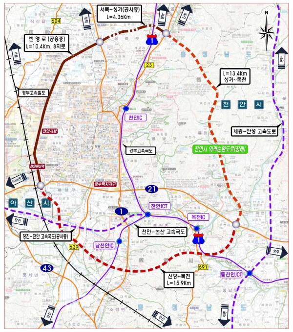 한편, 천안시는 ‘국도·국지도 5개년 계획’에 국도대체우회도로 ‘신방~목천’구간에 이어 ‘목천~성거’ 구간까지 반영시켜 지역 외곽순환도로건설을 장기적으로 추진할 방침이다.