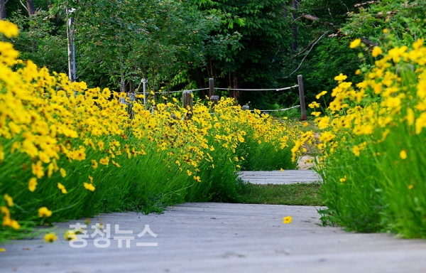 특히 철새박물관 뒤편의 산책로에는 금계국 등이 노란색의 물결을 이루고 있어 한 폭의 그림과 같은 장면을 연출하고 있다.