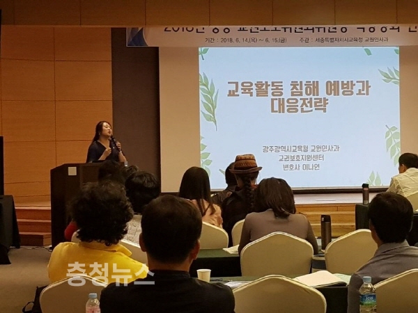 이번 연수는 올해 전문 상담사 등 인력을 보충하여 운영하고 있는 교원치유지원센터 소개에 이어 광주광역시교육청 이나영 변호사를 강사로 초빙해 ▲교육활동 침해 사례 ▲법령 이해 및 대응 방법 등에 대한 강의를 진행했다.