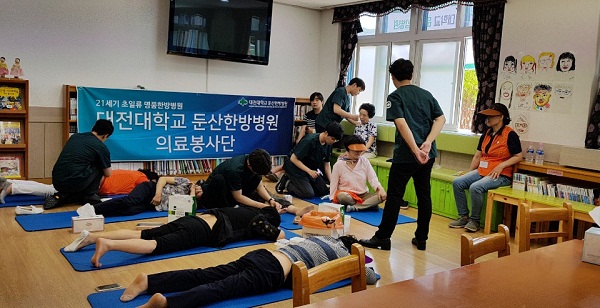 이번 봉사는 대전대 링크플러스 사업의 지원을 받았으며, 옥천군 군서면 지역주민들이 참여하는 총동문 축제의 일환으로 군서초등학교에서 진행됐다. 이날 의료봉사는 150여 명의 옥천군 지역민들을 대상으로 침과 뜸치료, 물리치료, 우황청심원 등 한방제제 약물 및 한방파스 등의 처방이 이뤄졌다.