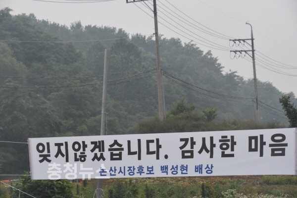 45.46%의 득표율을 보였지만 고배를 마신 백성현 논산시장 후보는 지역 곳곳에 현수막을 걸고 “잊지 않겠습니다. 감사한 마음”이라는 간결한 문구를 통해 지지자들에게 감사를 표했다.