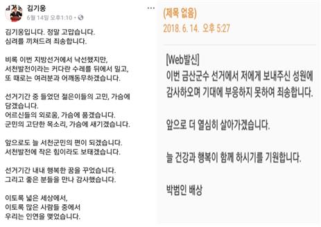 또 서천군수 선거전을 유례없는 3파전으로 이끈 무소속 김기웅 후보도 페이스북을 통해 “비록 이번 지방선거에서 낙선했지만, 서천발전이라는 커다란 수레를 뒤에서 밀고, 또 때로는 여러분과 어깨동무하겠다. 선거기간 내내 행복한 꿈을 꾸었고 좋은 분들을 만나 감사했다”며 심정을 전했다.