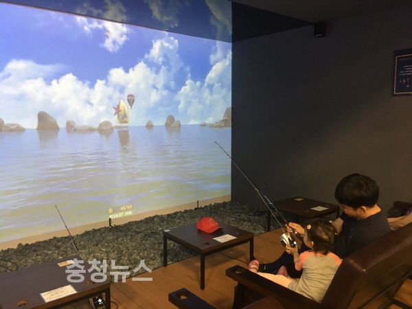 ‘피싱조이’는 실제 드론을 띄워 촬영한 시원한 바다 풍경을 대형 스크린 위에 VR로 생생하게 구현한 데다, 총 100여 종이 넘는 다양한 물고기를 시스템 상에 다채롭게 구현했다. 낚시 방법도 간단한데 파도가 넘실대는 스크린을 향해 낚싯대를 던지고 물고기가 찌를 물 때까지 기다리면 된다. 입질이 오는 순간 재빠르게 전자릴을 감으면 ‘월척’의 기쁨을 만끽할 수 있다.
