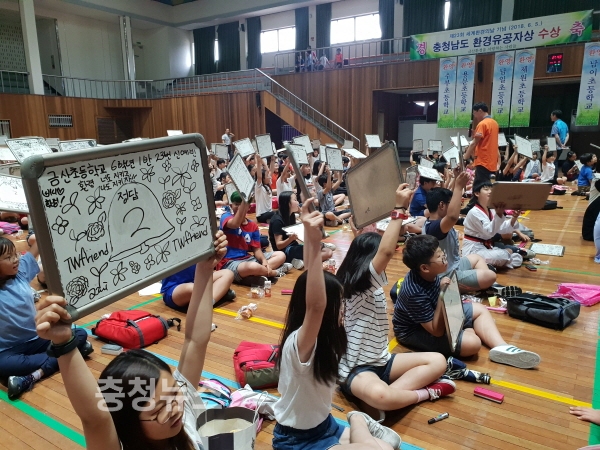금산군과 금산교육지원청, 금산환경을 사랑하는 사람들(회장 이조천)이 공동 주최한 이날 환경퀴즈대회에는 관내 초등학생 400여명이 참여해 선의의 경쟁을 펼쳤다.