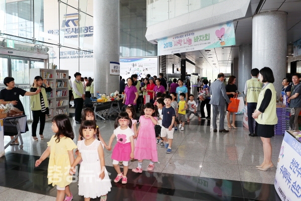 한국철도시설공단(이사장 김상균)은 22일 공단 본사(대전시 동구 소재) 1층에서 임직원과 대전 지역 복지기관 등 7개 기관이 참여한 가운데 ‘2018 사랑 나눔 바자회’를 개최했다.