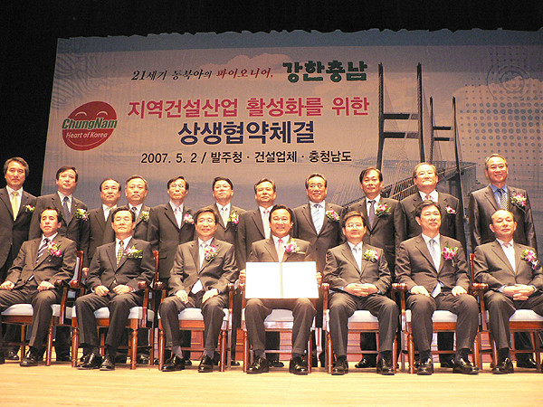 충남도가 지역건설산업 살리기에 발벗고 나섰다. 특히 이완구 도지사는 지난해 상생협약을 체결한 10개업체와 대형건설사 50개업체 대표에게 지역건설업체에게 공동도급 30%이상, 하도급 50%이상 수주와 관내 중소기업체에서 생산하는 건설자재 구입사용 등을 요청하는 협조서한문을 발송했다.