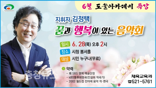 이번 특강은 ‘꿈과 행복이 있는 음악회’라는 주제로 김정택 SBS 명예 예술단장이 아름다운 피아노 연주와 함께 호흡하며 즐겁고 감동이 넘치는 강의를 진행할 예정이다.