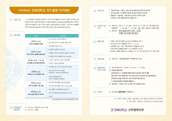 '푸드플랜 아카데미'는 올해 총 2회에 걸쳐 전문 교육기관을 통해 추진될 예정으로, 이번 교육은 전북대학교 산학협력단에서 시행하는 1기 과정이다.