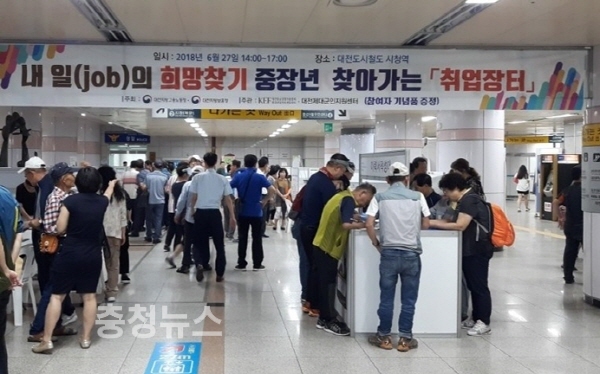 대전지방보훈청(청장 강윤진) 제대군인지원센터는 27일 오후 대전시청 지하철 역사에서 대전제대군인지원센터와 대전충남경총 중장년 일자리희망센터가 공동주관하는 2018 찾아가는 취업장터 ‘제대군인 일자리 두드림(Do Dream) 데이(Day) 행사’를 실시했다.
