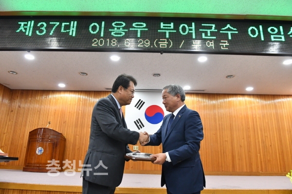 민선 5, 6기 부여군정을 이끌었던 이용우 부여군수가 29일 여성문화회관 3층에서 열린 이임식을 끝으로 8년간의 여정을 마쳤다.