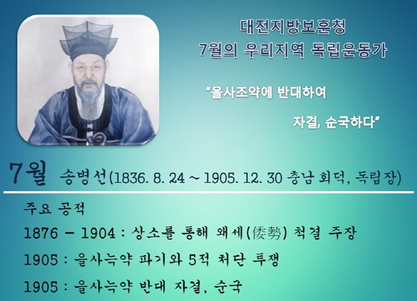 대전지방보훈청(청장 강윤진)은 청소년 및 시민에게 애국선열의 위국·헌신정신을 알리고 보훈정신 함양에 기여하고자『이달의 우리지역 독립운동가』를 선정한다고 29일 밝혔다.