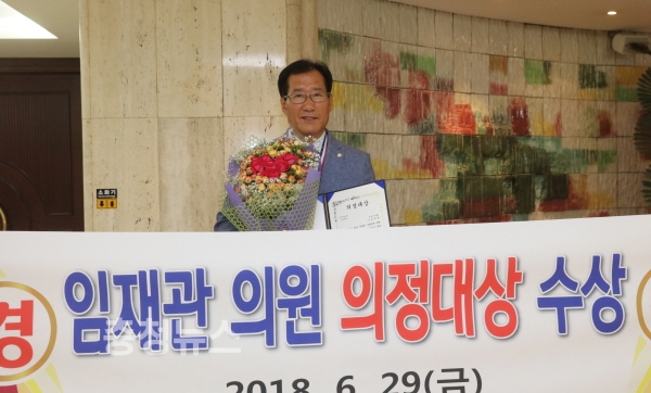 서산시의회에 따르면 임재관 의원은 29일 전국지역신문협회 주최로 한국프레스센터에서 개최된 제15회 지역신문의 날 기념식에서 지역발전을 위해 활발한 의정활동을 펼친 공로를 인정받아 의정대상을 수상했다.