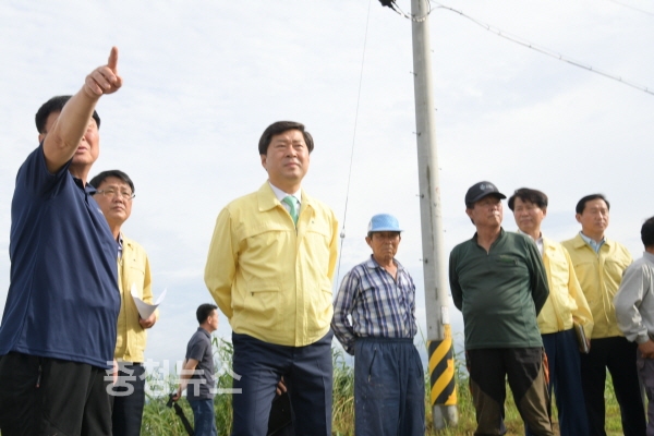 황명선 논산시장이 2일 오전 재해위험지구인 은진면 방축천과 중교천 등을 찾아 비 피해 현장을 점검하고 대책마련에 만전을 기해줄 것을 주문했다.